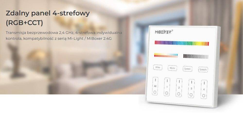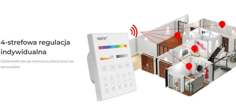 Sterownik dotykowy Mi-Light T4 to naścienny panel sterujący przeznaczony do obsługi kompatybilnego oświetlenia LED oraz sterowników Mi-Light/MiBoxer. Model T4 pracuje w systemie 4-strefowym, dzięki czemu umożliwia niezależne zarządzanie 4 grupami oświetlenia. Każdą strefę można osobno włączać, wyłączać i regulować według potrzeb. Panel jest zasilany bezpośrednio z sieci AC 100–240V i wykorzystuje stabilną komunikację radiową 2,4 GHz o zasięgu do 30 metrów, co zapewnia wygodne sterowanie oświetleniem w domu, biurze i innych przestrzeniach użytkowych.