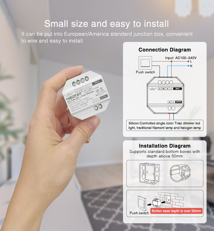Sterownik LED 230V Miboxer TRI-C1 to kontroler do oświetlenia 230V o maksymalnej mocy 300W. Nasz kontroler z powodzeniem sprawdza się w przypadku tradycyjnego oświetlenia i ściemnialnych źródeł światła LED zamieniając je w inteligentne pozwalając na ściemnianie, rozjaśnianie, włączanie/wyłączanie za pomoca pilotów firmy Milight, przez WiFI(wymagany adapter) lub za pomocą włącznika.