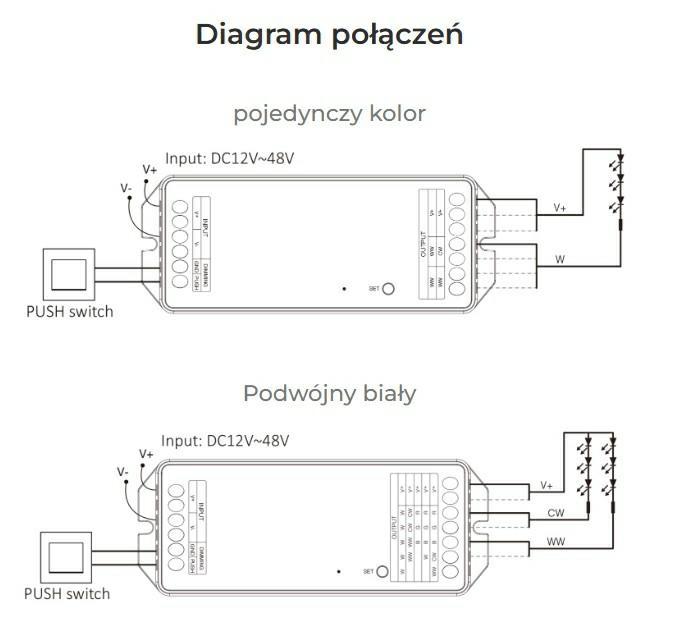 Sterownik radiowy Mi-Light PW2 to urządzenie, które służy do sterowania taśmami LED Mono i CCT zasilanymi prądem o napięciu 12V, 24V lub 48V. W zależności od wybranej wersji taśmy podłączymy do niego 240W LED 12V, 480 LED 24V lub aż 960W LED 48V. Odbiornik Mi-Light PW2 podłączamy między zasilaczem, a samą taśmą LED i posłuży on nam do sterowania jednokolorowym oświetleniem LED lub o zmiennej barwie światła białego 2700K-6500K. Odbiornik Mi-Light PW2 możemy kontrolować przy pomocy pilotów z serii Mi-Light, a także z poziomu aplikacji Tuya SMART.