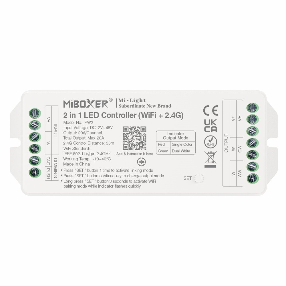 Sterownik Mi-Light 2w1 PW2 20A przeznaczony do obsługi jednokolorowych taśm LED i wersji CCT o zmiennej temperaturze światła białego. Kompatybilny z urządzeniami zasilanymi prądem o napięciu 12V, 24V lub 48V. Kontroler radiowy z możliwością sterowania pilotem lub aplikacją Tuya SMART.