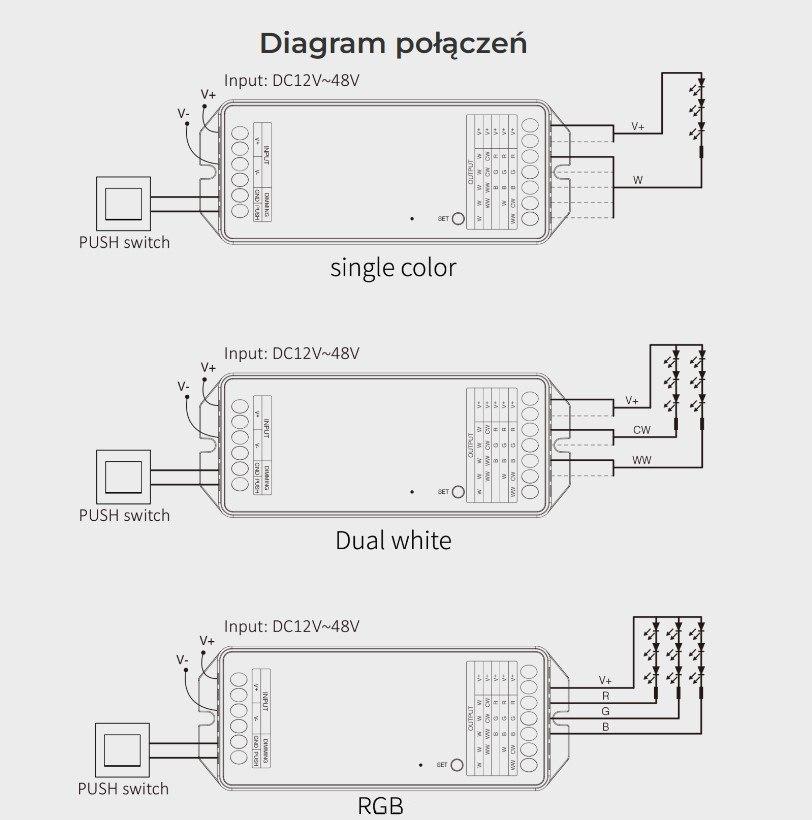 Sterownik radiowy MiLight PR5 to bardzo kompaktowe i uniwersalne urządzenie, które obsłuży wszystkie modele taśm LED 12V, 24V lub 48V (wybór trybu za pomocą przycisku na obudowie). W zależności od wybranej wersji taśmy podłączymy do niego 240W LED 12V, 480W LED 24V, lub aż 960W 48V. Odbiornik Mi-Light PR5 instalujemy między zasilaczem, a samą taśmą LED i posłuży on nam do sterowania oświetleniem LED jednokolorowym lub o zmiennej barwie światła RGB i CCT.
