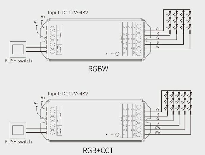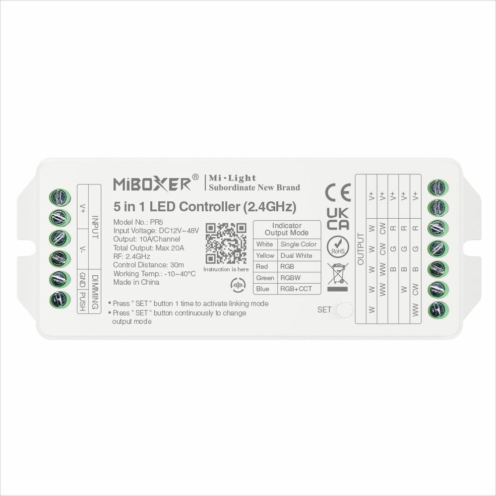 Kontroler PR5 to uniwersalny model urządzenia Mi-Light o podwyższonej maksymalnej mocy (do 20A), który z powodzeniem obsłuży każdy model taśmy LED 12V, 24V lub 48V. Zmiany trybu pracy urządzenia dokonujemy za pomocą przycisku znajdującego się na jego obudowie.