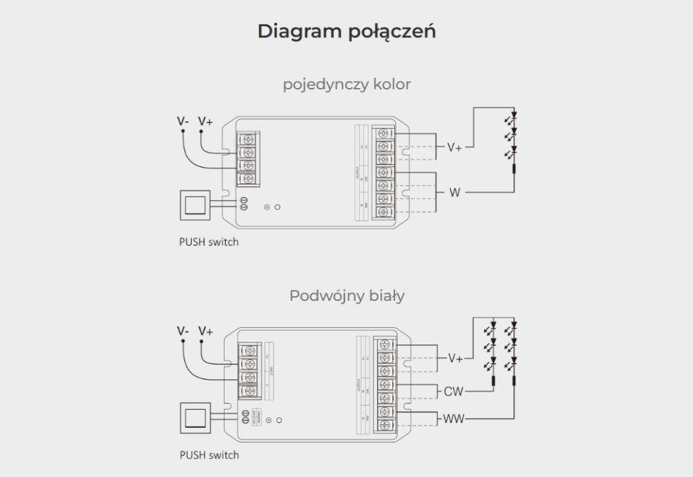 Sterownik HR2 został zaprojektowany do współpracy z dwoma popularnymi typami instalacji LED. Dzięki temu jeden model może zostać wykorzystany zarówno w klasycznych układach jednokolorowych, jak i w nowoczesnym oświetleniu o regulowanej temperaturze barwowej bieli.