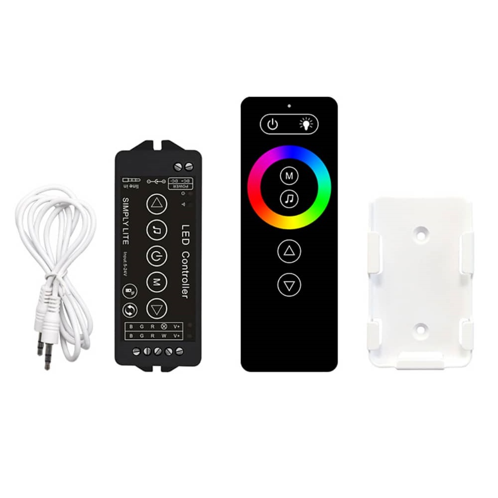 Wybierając nasz sterownik SmartLite w zestawie otrzymasz wszystkie niezbędne akcesoria do sterowania oświetleniem RGB i RGBW. Prócz pilota do zdalnego sterowania i odbiornika podłączanego między zasilaczem, a taśmą LED, znajdziesz tam również uchwyt na pilota i przewód do podłączenia wejścia dźwięku Audio.
