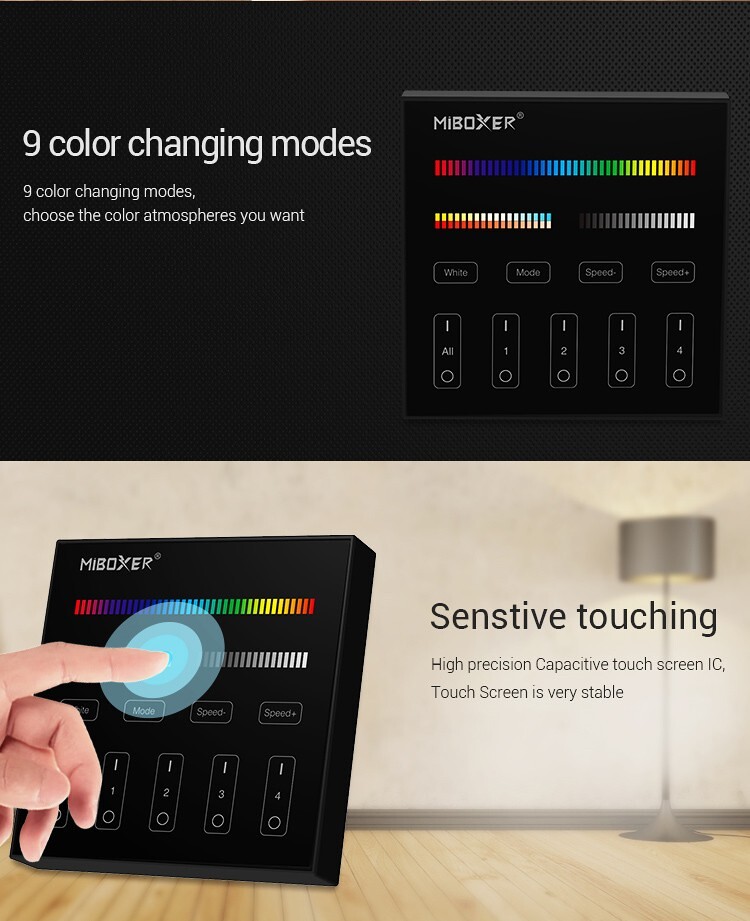 Sterownik naścienny MiLight B4-B to czarny, dotykowy sterownik RGB+CCT zasilany bateryjnie 2xAAA. Możesz dowolnie go przenosić, a także zamontować na ścianie Twojego domu. Łączy się z odbiornikami drogą radiową.