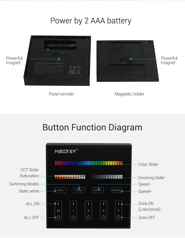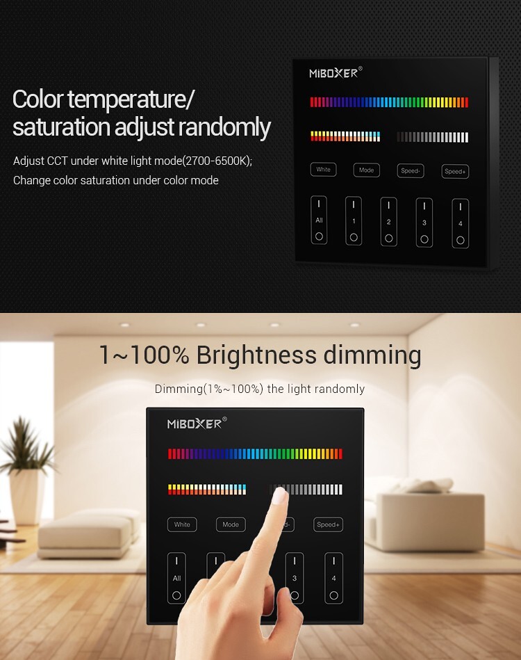 Sterownik naścienny B4-B Mi-Light to kontroler bateryjny przeznaczony do obsługi produktów serii RGB i CCT (do taśm LED RGB ze zmienną barwą bieli). Pilot naścienny MiLight B4-B czarny umożliwia płynną zmianę koloru światła z palety RGB i regulację jasności światła białego oraz jego temperatury, poprzez bezprzewodową komunikację z podłączonymi do taśm LED odbiornikami. Urządzenie przeznaczone jest do instalacji natynkowej za pomocą dołączonej taśmy dwustronnej lub śrub, a zasilimy je przy pomocy baterii 2 x AAA. Sterownik MiLight B4-B ma również wiele dodatkowych funkcji jak zarządzanie oświetleniem LED w systemie 4-strefowym czy ustawienie predefiniowanego trybu świecenia.