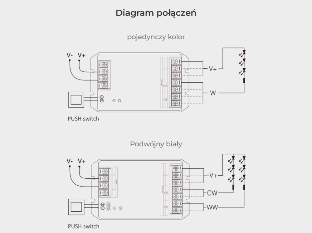 Sterownik HW2 został zaprojektowany do współpracy z dwoma popularnymi typami instalacji LED. Dzięki temu jeden model może zostać wykorzystany zarówno w klasycznych układach jednokolorowych, jak i w nowoczesnym oświetleniu o regulowanej temperaturze barwowej bieli.