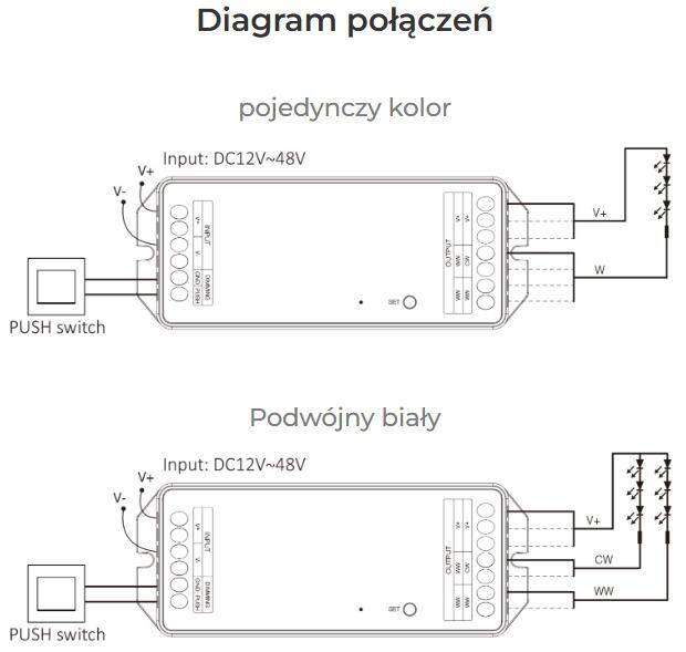 Sterownik PW2 został zaprojektowany do współpracy z dwoma popularnymi typami instalacji LED. Dzięki temu jeden model może zostać wykorzystany zarówno w klasycznych układach jednokolorowych, jak i w nowoczesnym oświetleniu o regulowanej temperaturze barwowej.