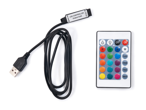 Sterownik RGB z pilotem na podczerwień przeznaczony do oświetlenia 5V. Pilot z możliwością wyboru jednego z 15 statycznych kolorów, wyposażony we wtyk USB i gniazda RGB.