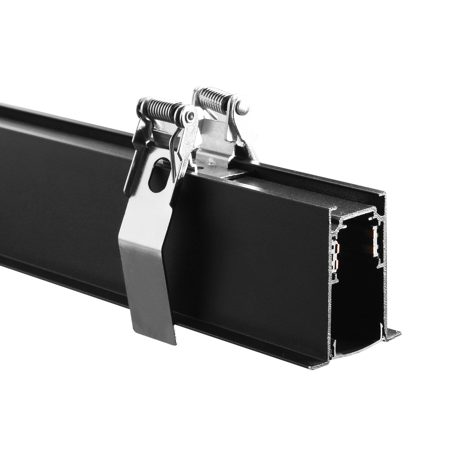 Czarna szyna magnetyczna z klipsami montażowymi (3 sztuki) wpuszczana w sufit o długości 2m wykonana z wysokiej jakości aluminium. Szynoprzewód magnetyczny wpuszczany z klipsami został przystosowany do szynowych opraw magnetycznych zasilanych prądem o 48V DC. Wykorzystując szynoprzewód, lampę oraz dodatkowe złączki jesteśmy w stanie stworzyć solidne oświetlenie, które zapewni wyjątkowy element dekoracyjny. Szyna stosowana jest do montażu wpuszczanego w sufit za pomocą dołączonych do zestawu sprężyn montażowych.