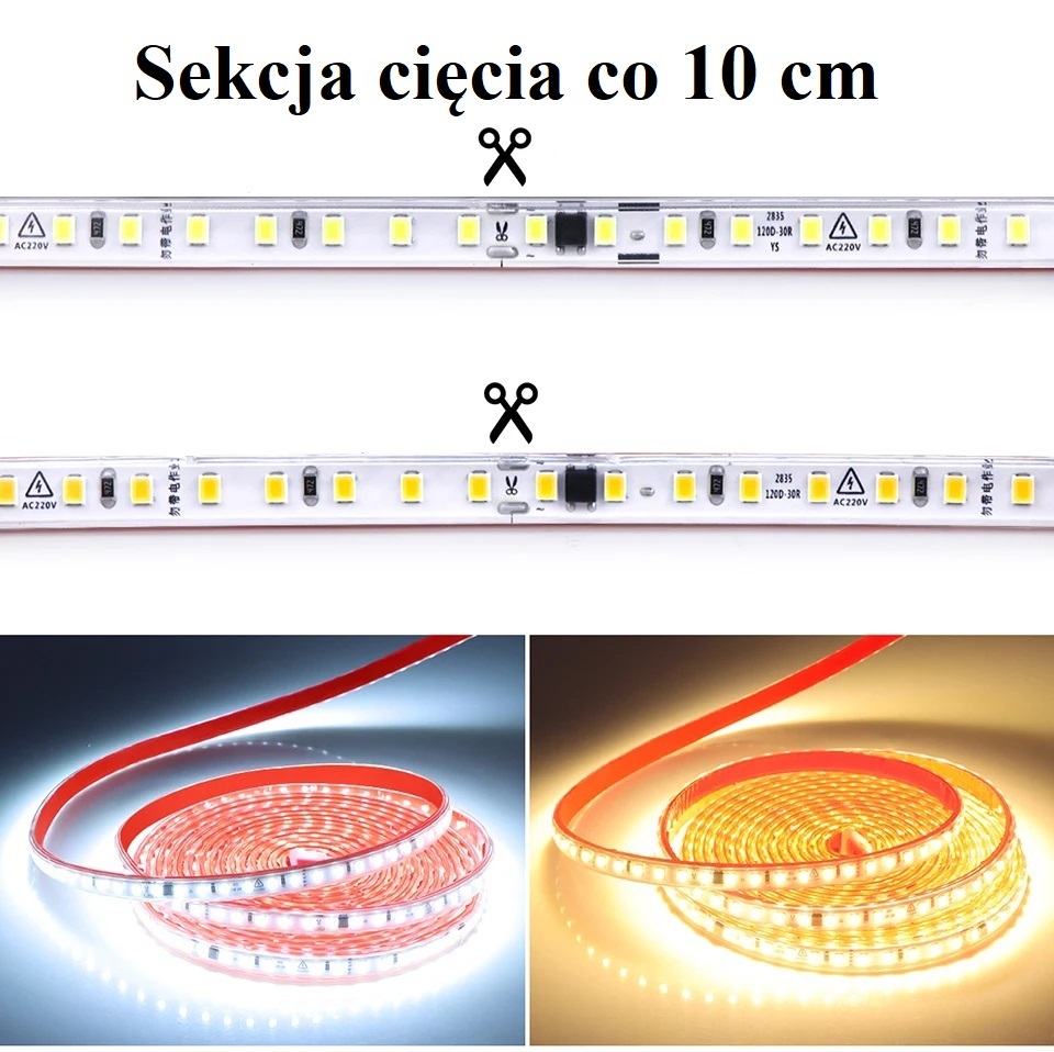 Taśma LED 230V SMD2835 w wersji Nano z sekcją cięcia co 10cm. Taśma LED 230V o neutralnej barwie światła, którą podłączysz bez zasilacza i stabilizatora. Wyposażona w wodoodporną powłokę IP65 i dwustronną taśmę klejącą.