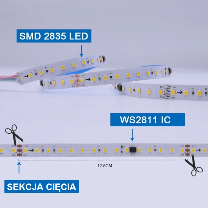Niesamowity efekt płynącego światła możemy uzyskać wyłącznie dzięki cyfrowej taśmie LED wyposażonej w mikroprocesory sterujące WS2811. Wszystkie tego typu programy oraz nieskończenie wiele innych można uzyskach za pomocą dedykowanych kontrolerów Digital. Metr taśmy LED Cyfrowej został wyposażony w 120 diod SMD2835 i chipy WS2811 co pozwala na indywidualne sterowanie każdą jej sekcją (co 12,5 cm/15 diod). Wybierając taśmy LED Cyfrowe, będziesz mieć możliwość wyselekcjonowanego włączenia każdej z jej sekcji.
