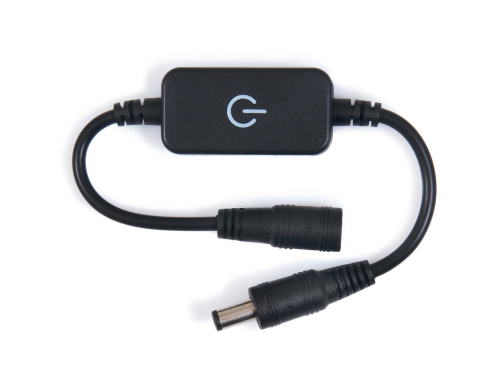 Czarny włącznik dotykowy ze ściemniaczem w wersji Mini, przeznaczony do sterowania jednokolorowymi taśmami LED. Prosty włącznik z przewodem, wyposażony w gniazdo i wtyk DC.