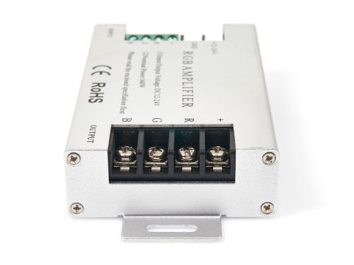 Wzmacniacz sygnału do taśm LED RGB współpracuje zarówno z kolorowymi taśmami LED, jak i tymi w wersji jednokolorowej. Wzmacniacz LED RGB umożliwia podłączenie do jednego sterownika szeregu taśm LED bez pojawiania się efektu zanikania napięcia. Wykorzystując wzmacniacz sygnału RGB sprawisz, że Twoja taśma LED będzie świecić w pełni jednolicie, nawet przy dłuższych odcinkach kontrolowanych przy użyciu wyłącznie jednego sterownika.