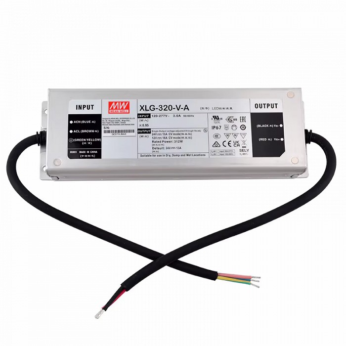 Zasilacz Mean Well XLG-320-V-A z możliwością regulacji napięcia 12V/24V. Oferuje moc 216W przy 12V i aż 312W przy napięciu 24V. Komponent stałonapięciowy przeznaczony do pracy z oświetleniem LED. Wyposażony w metalową i hermetyczną obudowę IP67.
