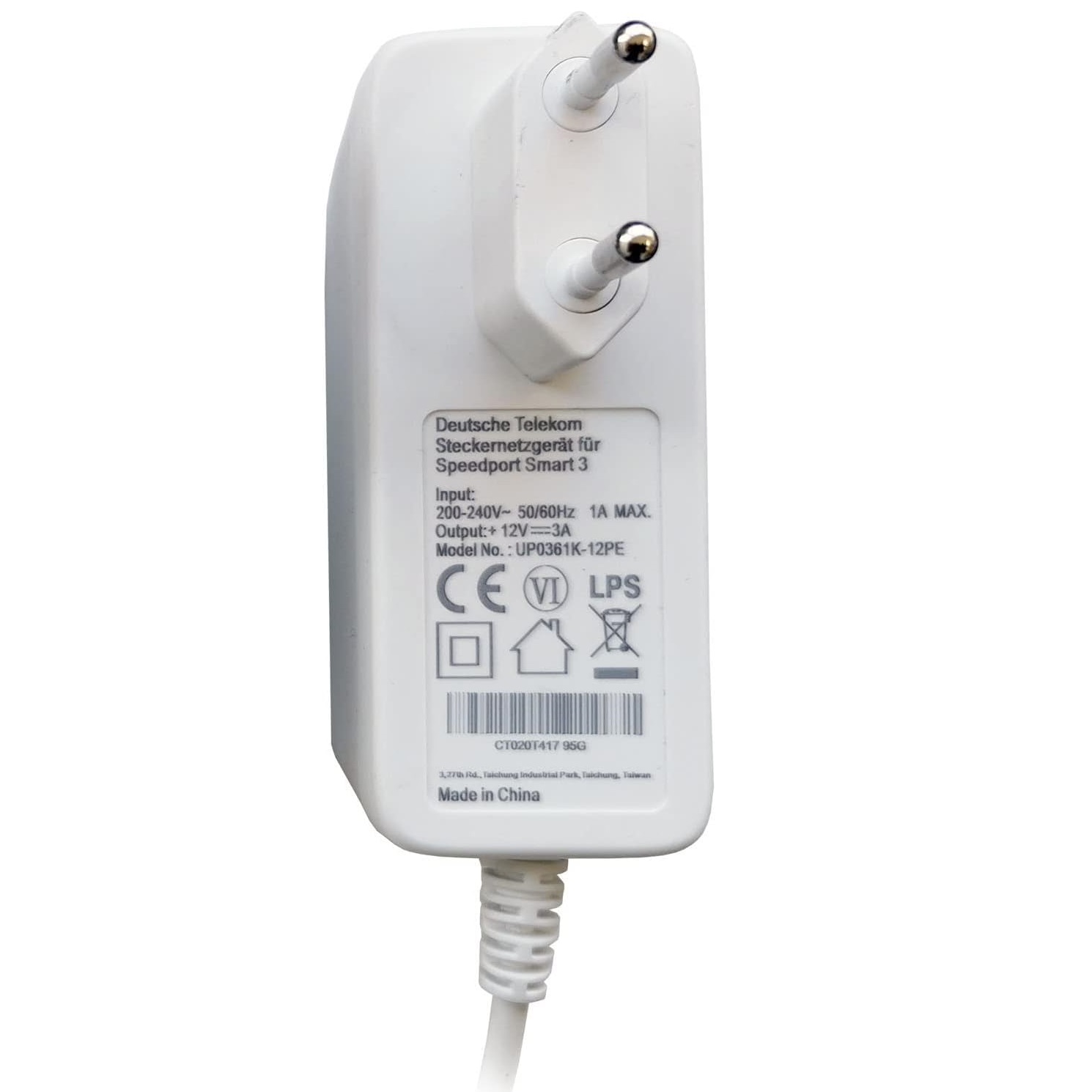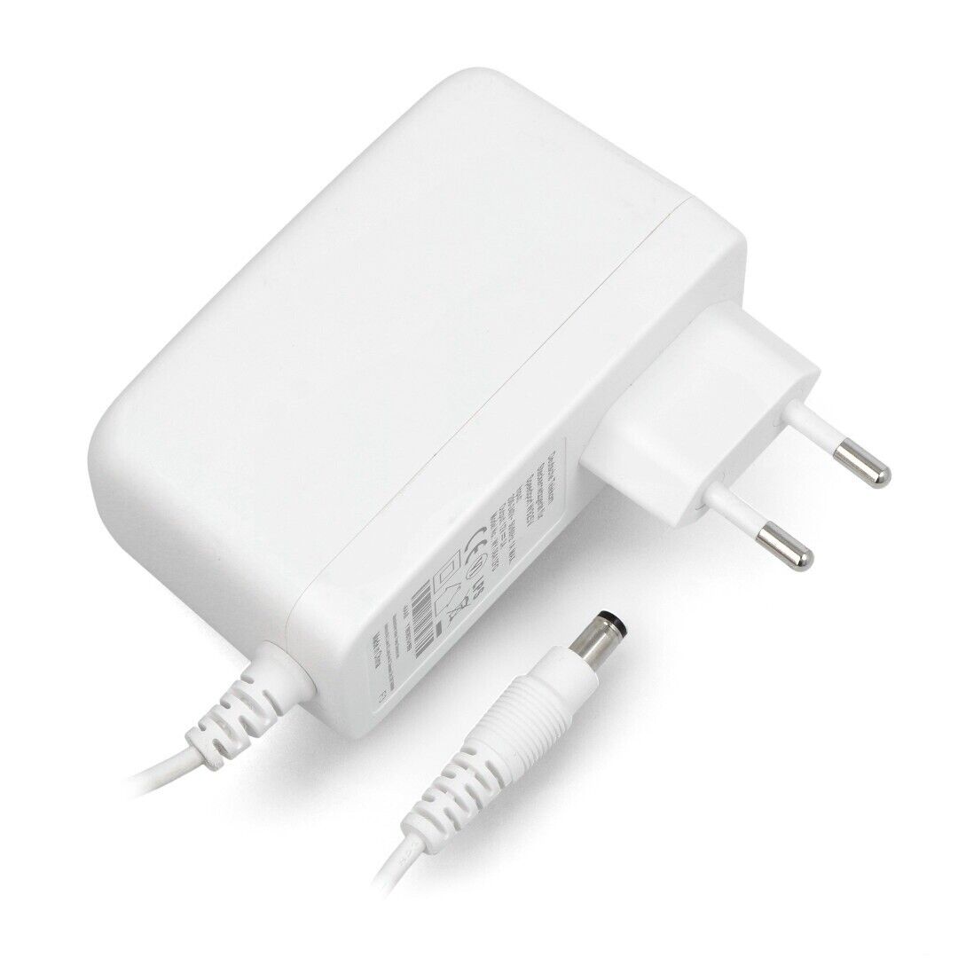 Biały zasilacz wtyczkowy 12V o mocy 36W przeznaczony do zasilania urządzeń elektronicznych o stabilizowanym napięciu wejściowym. Zasilacz o szerokim zakresie napięcia wejściowego AC 200-240V wyposażony we wtyk DC 2.1/5.5 mm.