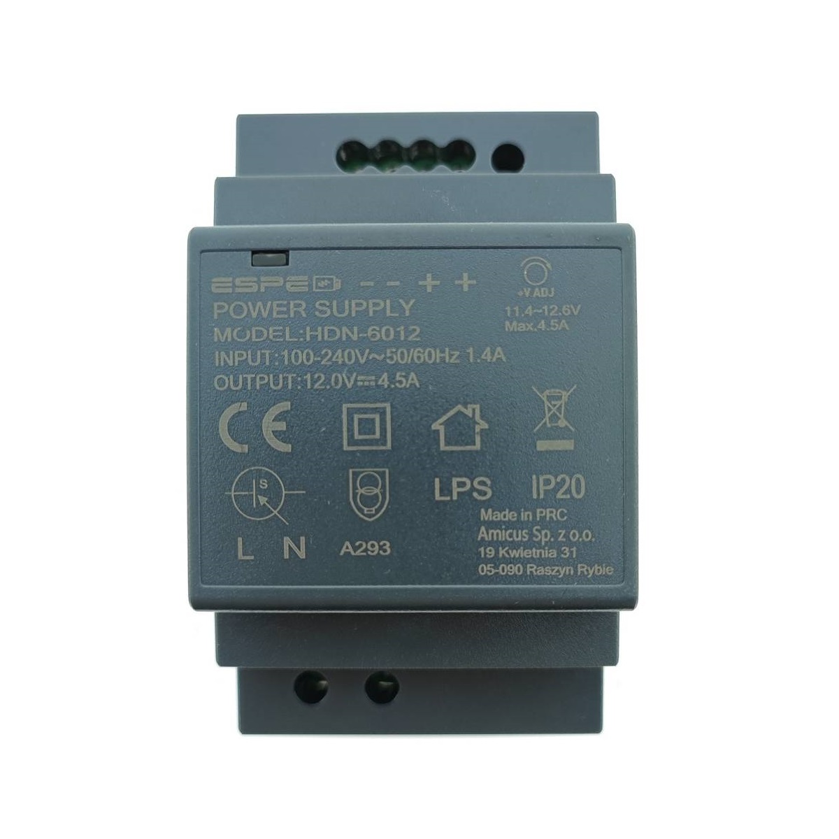 Zasilacz na szynę DIN 12V HDN PRO o mocy 54W przeznaczony do montażu w szynie DIN TS35. Profesjonalny zasilacz przeznaczony do pracy z oświetleniem oraz automatyką przemysłową i budowlaną.