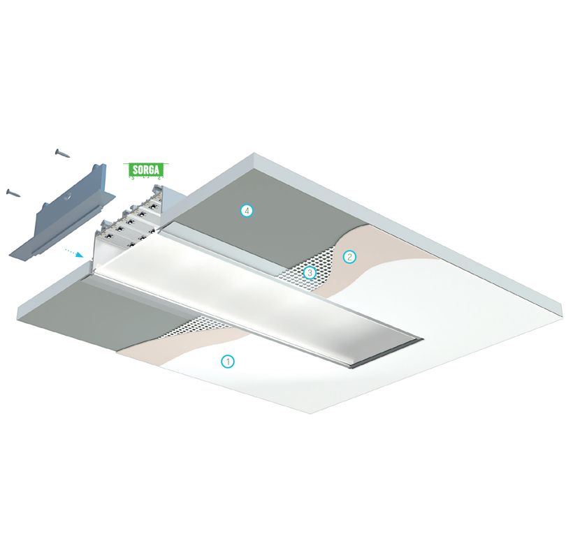 Przedstawienie etapów montażu z wykorzystaniem profilu SORGA w zabudowie bezpośredniej [1. farba, 2. gips, 3. siatka, 4. płyta kartonowo-gipsowa].