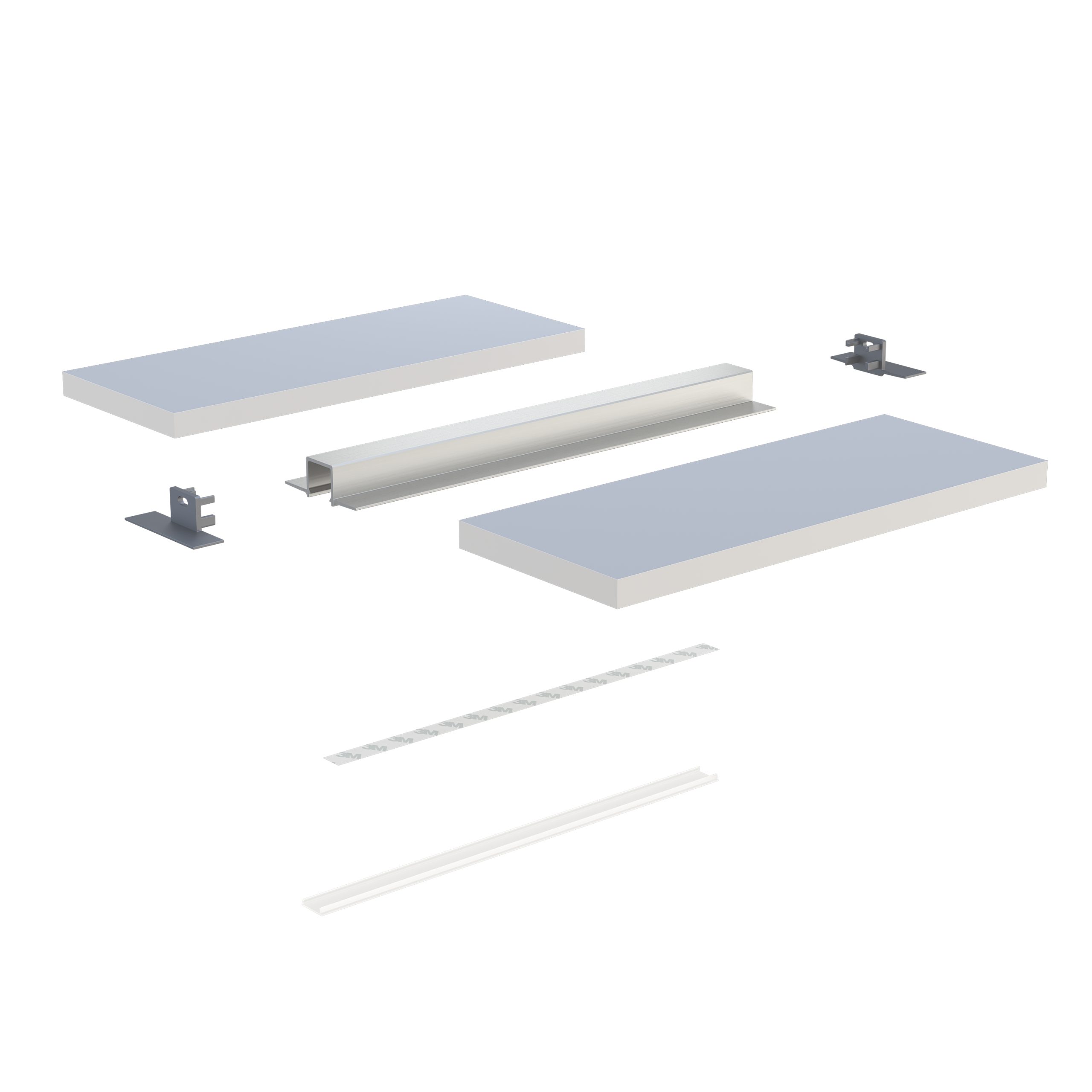 Schemat złożenia elementów systemu oświetleniowego z wykorzystaniem profilu GAUDI oraz (1) klosza BASIC, (2) taśmy LED, (3) zaślepek