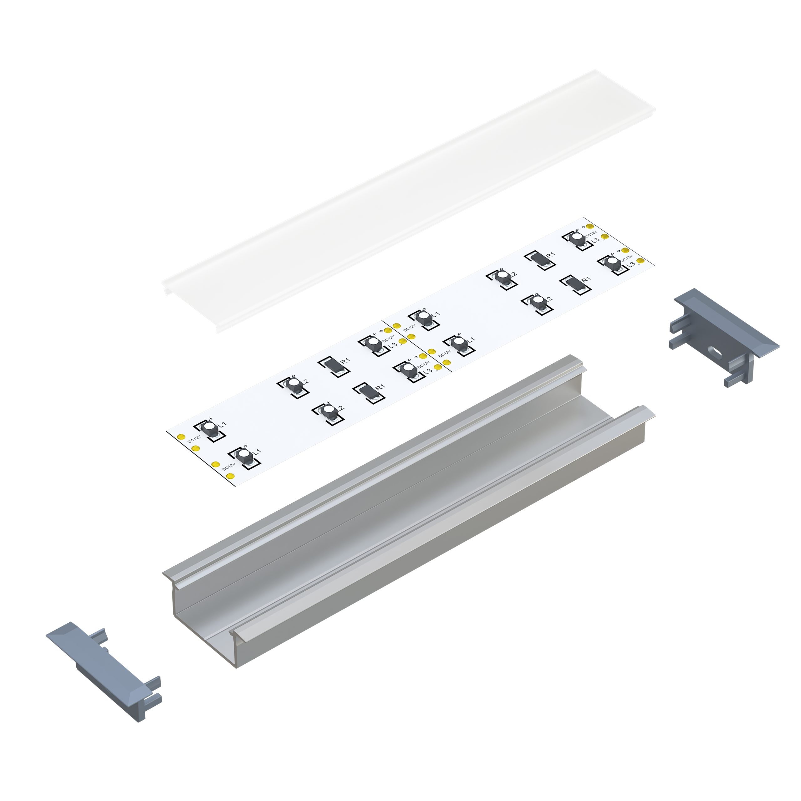 Schemat złożenia elementów systemu oświetleniowego z wykorzystaniem profilu GEMI oraz (1) klosza DOUBLE, (2) taśmy LED, (3) zaślepek