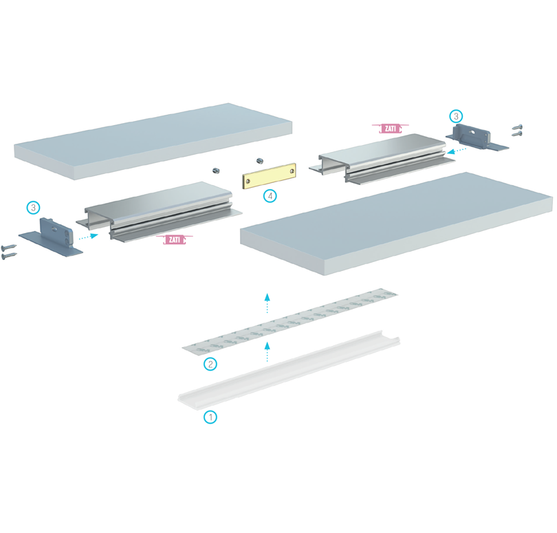 Schemat złożenia elementów systemu oświetleniowego w zabudowie bezpośredniej z wykorzystaniem profilu ZATI (1) klosza DOUBLE, (2) taśm LED, (3) zaślepek ZATI z otworem, (4) łącznika prostego.