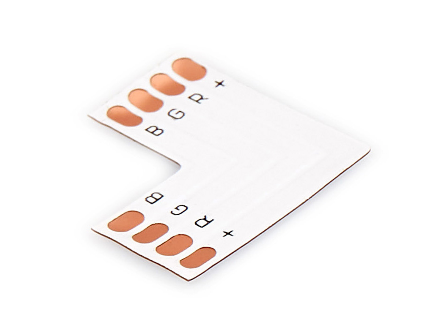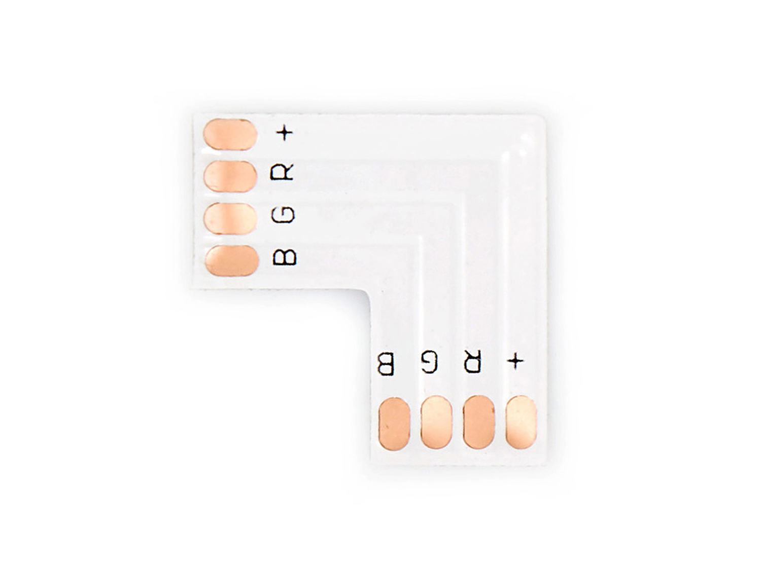 Złączka kątowa typ L przeznaczona do wielokolorowych taśm LED RGB o szerokości 10 mm. Złączka kątowa z obu stron posiada miedziane ścieżki, które pozwolą nam na szybkie przylutowanie taśm LED. Złączka kątowa do taśm LED pozwoli nam na bezpieczne i trwałe połączenie dwóch odcinków LED pod kątem 90 stopni. Złączka dostępna w naszej ofercie przeznaczona jest do taśm LED o szerokości 10 mm, czyli najczęściej wybieranych pasków LED RGB z diodami SMD 5050. Złączkę można wykorzystać do zwykłej taśmy LED, a także wodoodpornej, jednak w tym przypadku należy wcześniej usunąć jej silikonową osłonę w miejscu podłączenia.