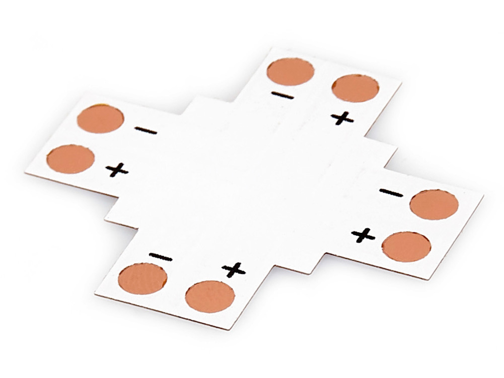 Złączka poczówrna typ X przeznaczona do jednokolorowych taśm LED SMD5050 o szerokości 10 mm. Złączka poczwórna z czterech stron posiada miedziane ścieżki, które pozwolą nam na szybkie przylutowanie taśm LED. Złączka typ X do taśm LED pozwoli nam na bezpieczne i trwałe połączenie czterech odcinków LED. Złączka dostępna w naszej ofercie przeznaczona jest do taśm LED o szerokości 10 mm, czyli najczęściej wybieranych pasków LED z diodami SMD 5050. Złączkę można wykorzystać do zwykłej taśmy LED, a także wodoodpornej, jednak w tym przypadku należy wcześniej usunąć jej silikonową osłonę w miejscu podłączenia.