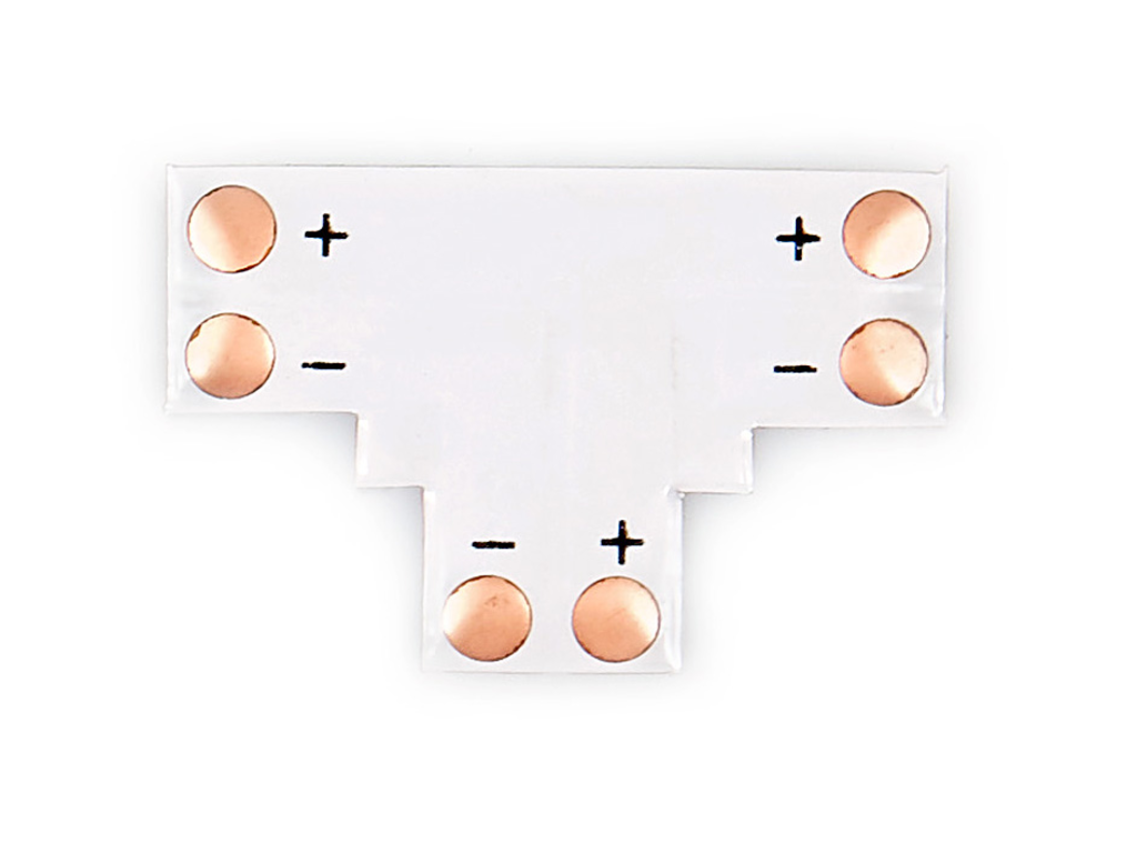 Złączka trójnik typ T przeznaczona do jednokolorowych taśm LED SMD2835/3528 o szerokości 8 mm. Złączka trójnik z trzech stron posiada miedziane ścieżki, które pozwolą nam na szybkie przylutowanie taśm LED. Złączka typ T do taśm LED pozwoli nam na bezpieczne i trwałe połączenie trzech odcinków LED. Złączka dostępna w naszej ofercie przeznaczona jest do taśm LED o szerokości 8 mm, czyli najczęściej wybieranych pasków LED z diodami SMD 2835 i SMD 3528. Złączkę można wykorzystać do zwykłej taśmy LED, a także wodoodpornej, jednak w tym przypadku należy wcześniej usunąć jej silikonową osłonę w miejscu podłączenia.